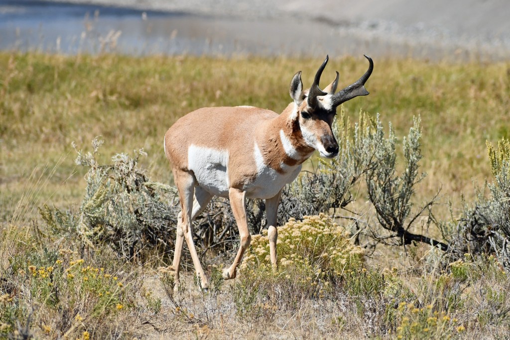 The pronghorns are also plentiful, and we stop and exit the car so I can get a shot with my zoom lens. Pronghorn, which are akin to antelope, are known by their tan hides with white bellies and white strips on their chests. Their thick, sharp black devil horns curve inward at the top.