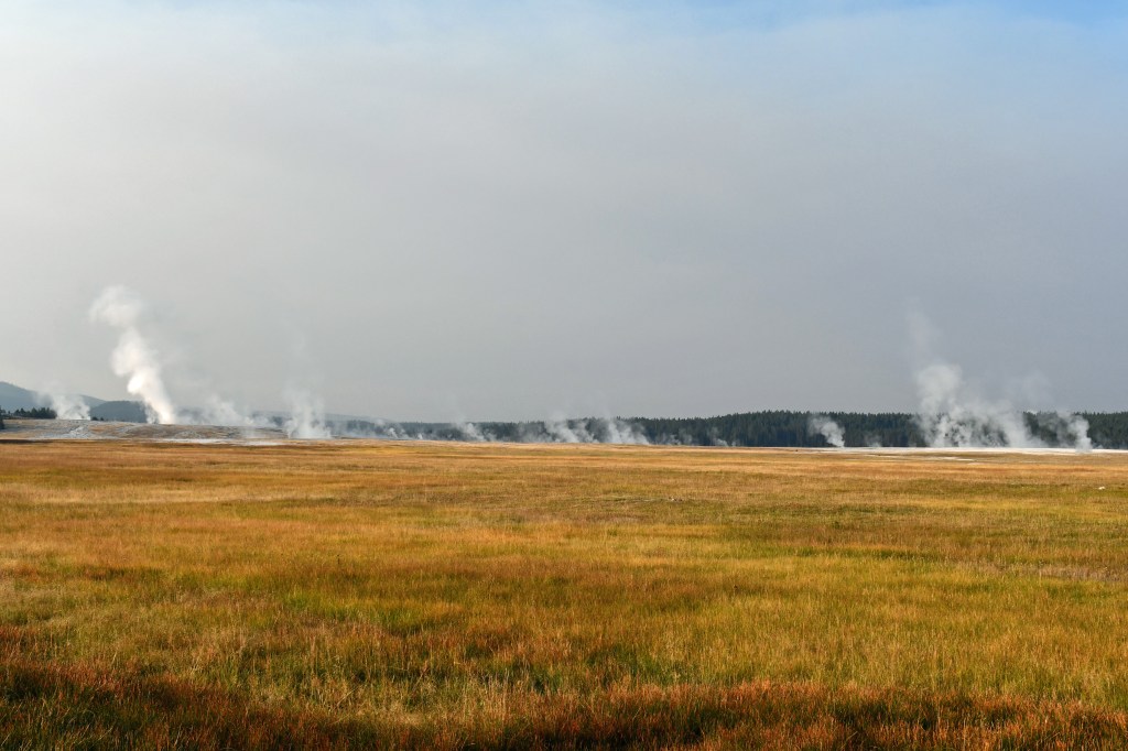 We enter the park early, hoping for less traffic at Old Faithful. The morning dew still hugs stalks of wild grass, and columns of steam rise across the main geyser basin, as if the earth is exhaling all it took in the night before.