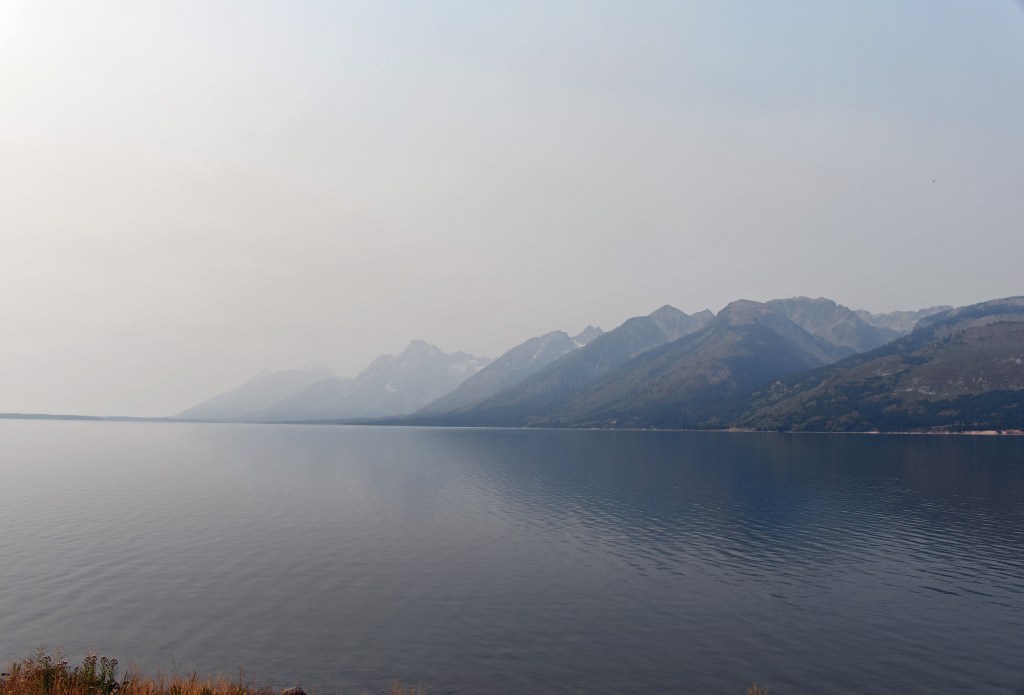 Mom and I venture south to the Tetons, which are hidden by smoke from nearby fires. Disappointed, we return to Yellowstone where we join a line of cars slowly passing a black bear by the side of the road munching on a bush. When it is our turn, I roll the passenger window down.