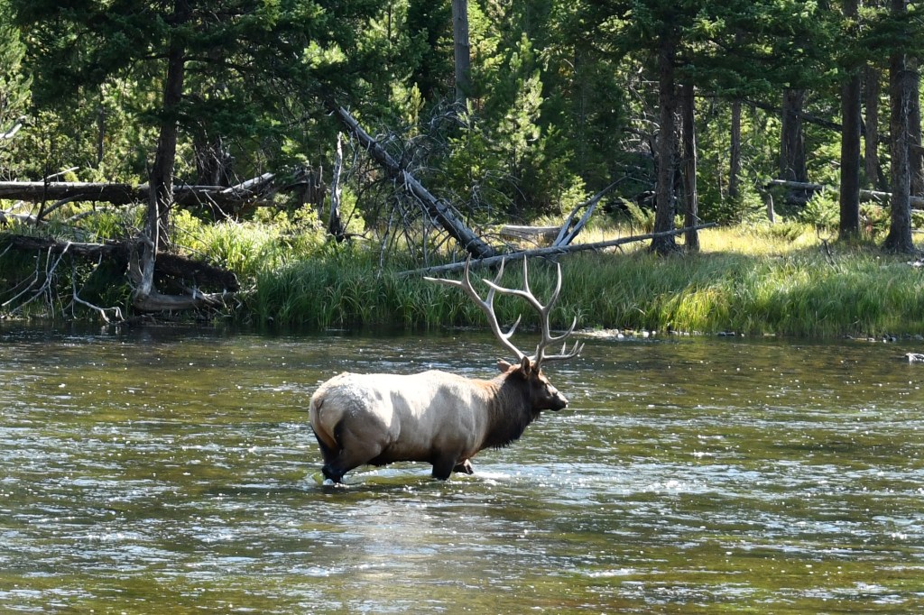 It is a hot day for September. As we return to the West Yellowstone entrance, we see a herd of elk standing in the Madison River staying cool. A great 6-point bull keeps watch over his family. Elk are the sentries of this place, and we are all just visitors here.