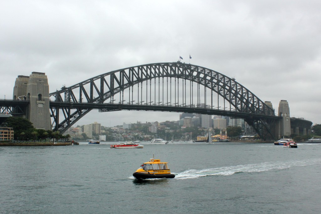 A week later, after the conference is done, my American colleague Rackets and I leave our hotel in Parramatta, a suburb of Sydney with many international restaurants and huge flying foxes (bats). It is cool and lightly raining when we board the ferry that will take us down the Parramatta River to Sydney Harbour. We stand outside on the boat’s bow, rain pelting our faces, as we pass under the 1,149-meter-long bridge. A line of people who look like ants are climbing the arch.