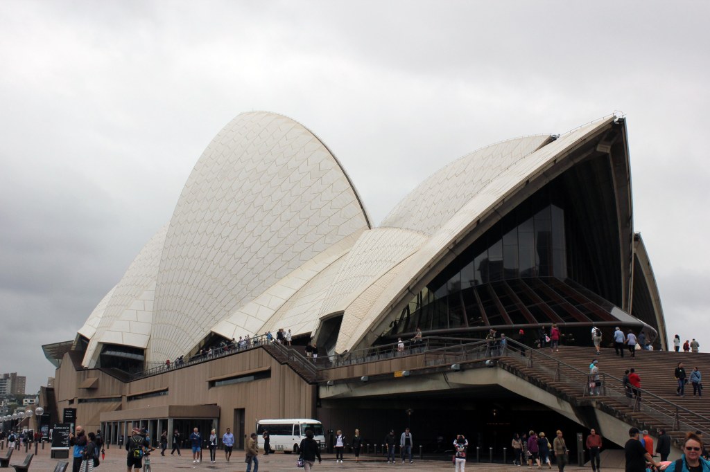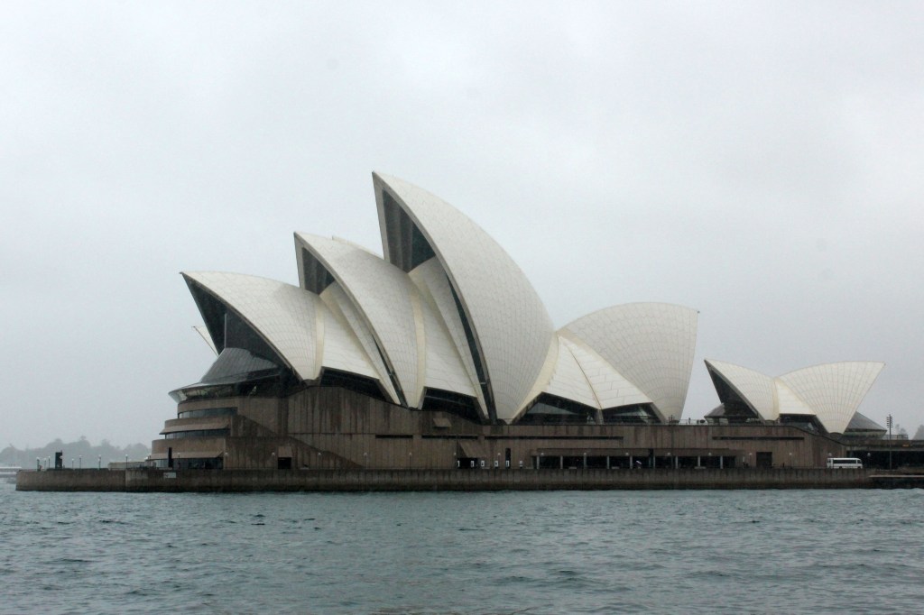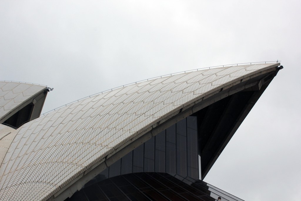 With a wet camera and subdued spirit, I walk the perimeter of the building, which is 183 meters long and 120 meters wide at its widest point. According to Wikipedia, “The facility features a modern expressionist design, with a series of large precast concrete ‘shells,’ each composed of sections of a sphere of 75.2 metres radius, forming the roofs of the structure, set on a monumental podium.”